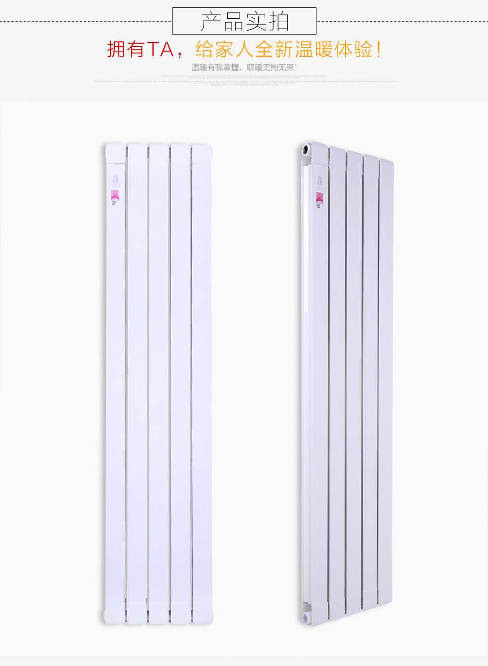 1、銅鋁復(fù)合暖氣片由上下護(hù)罩和主體兩部分組成,上下護(hù)罩可分為單體和通體兩種,通過護(hù)罩的散熱窗口有百葉窗式、波浪式等多種選擇,護(hù)罩可靈活拆卸,以方便維護(hù);主體結(jié)構(gòu)分單水道和雙水道兩種,其他均形同。外表采用先進(jìn)的靜電噴塑和烘干工藝,色彩艷麗,經(jīng)久耐用,清潔方便。